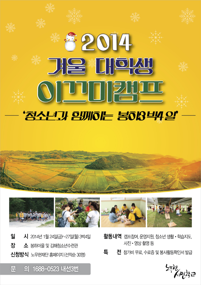 ³ë¹«Çö½Ã¹ÎÇб³´Â ¿ÃÇØºÎÅÍ´Â ´ëÇлýÀ̲ô¹ÌµéÀÇ ¿øÈ°ÇÑ È°µ¿À» Áö¿øÇϱâ À§ÇØ Ã»¼Ò³âÄ·ÇÁº¸´Ù ÇÏ·ç ¾Õ¼± 1¿ù 24ÀÏ(±Ý)ºÎÅÍ 27ÀÏ(¿ù)±îÁö 3¹Ú4Àϰ£ ¡®´ëÇлýÀ̲ô¹ÌÄ·ÇÁ¡¯¸¦ ¿î¿µÇÕ´Ï´Ù.
